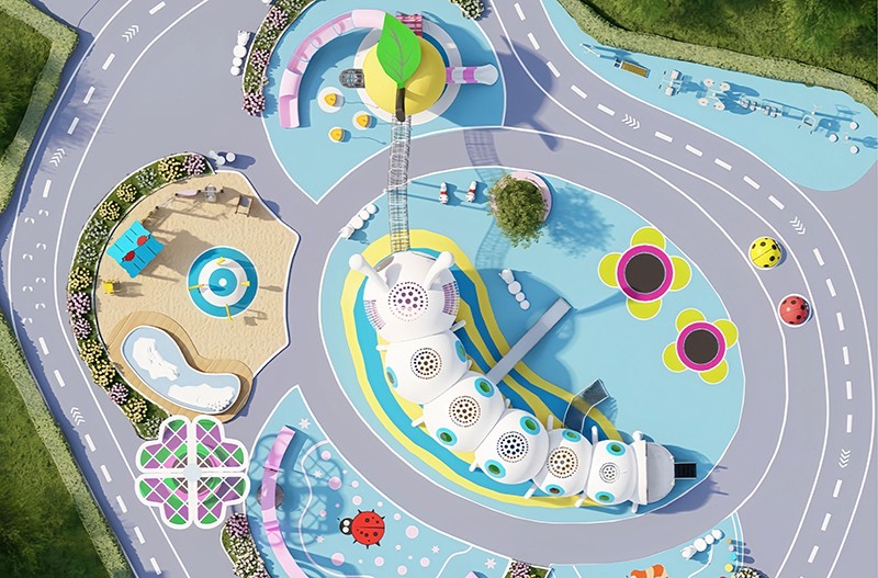 小区游乐场会合理搭配不同难易程度的游乐设备,既有适合低龄小朋友玩的难度低的游乐设备,如传声筒、简易秋千等;也有适合大龄孩子玩的具有挑战性的游乐设备,如绳网攀爬体能拓展设备等,满足不同年龄段居民的游乐需求。