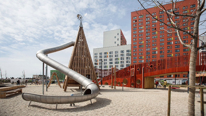 金字塔新型儿童乐园设计的初衷是建立一个可以促进居民交流互动的场所,设计师将颇具吸引力的游乐场区域放置在场地中央,四周绿植环绕,形成一个游乐空间,即使吸引外部游客来到游乐区,也能保证生活空间的安静和私密。