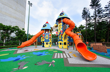 几何空间儿童公园沿用了数学中的几何元素,以明亮的黄色为塑胶场地......